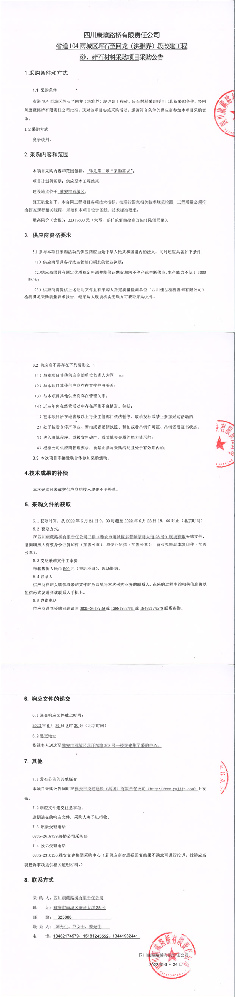 四川康藏路橋有限責(zé)任公司省道104雨城區(qū)坪石至回龍(洪雅界)段改建工程砂、碎石材料采購項(xiàng)目采購公告