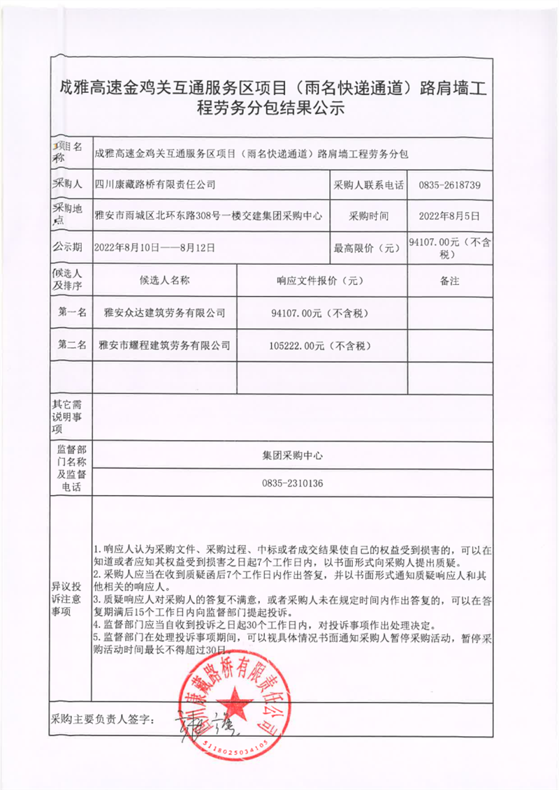 四川康藏路橋有限責任公司成雅高速金雞關互通服務區(qū)項目(雨名快速通道)路肩墻工程勞務分包結果公示