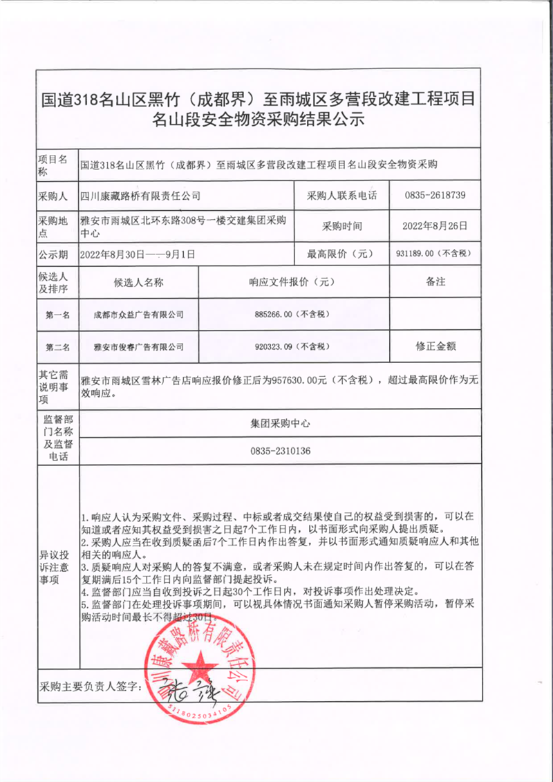 四川康藏路橋有限責任公司國道318名山區(qū)黑竹(成都界)至雨城區(qū)多營段改建工程項目名山段安全物資采購結(jié)果公示