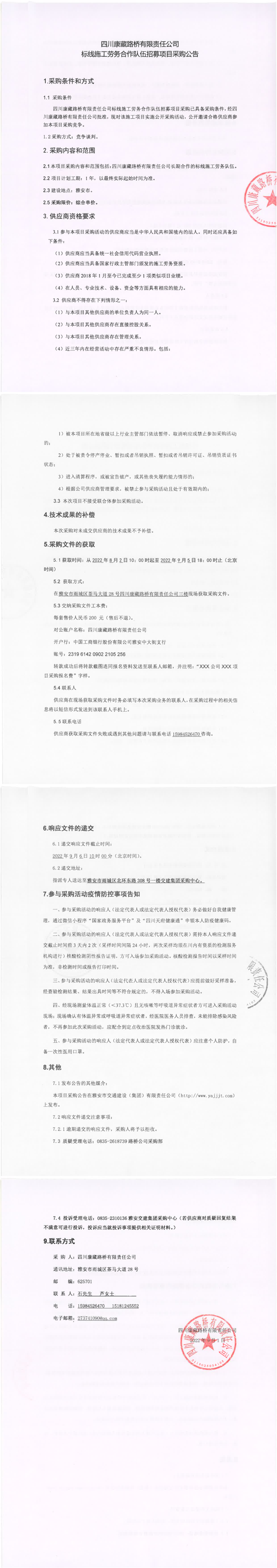 四川康藏路橋有限責任公司標線施工勞務(wù)合作隊伍招募項目采購公告
