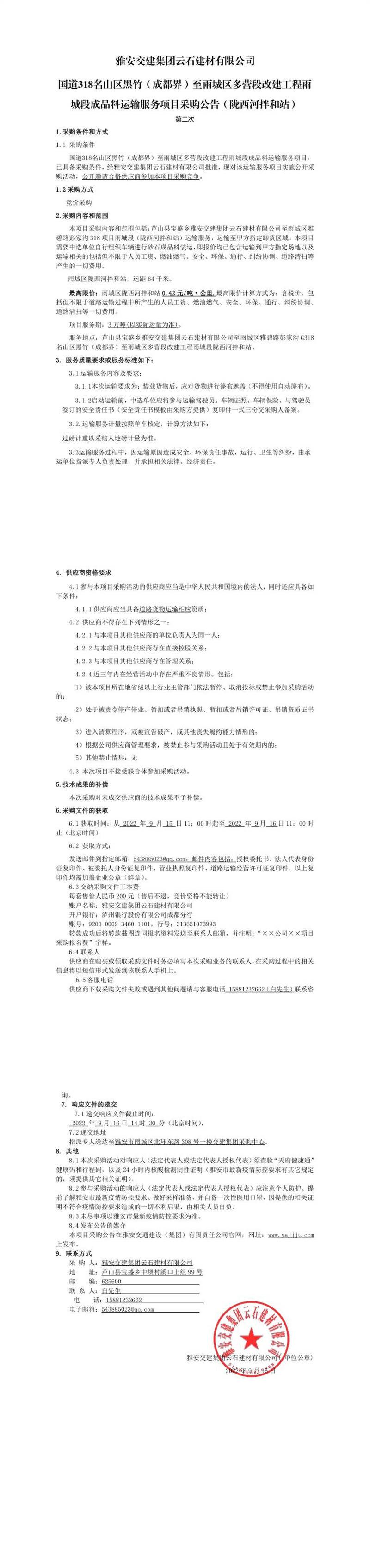 雅安交建集團云石建材有限公司國道318名山區(qū)黑竹(成都界)至雨城區(qū)多營段改建工程雨城段成品料運輸服務(wù)項目(隴西河拌和站)競價結(jié)果公示