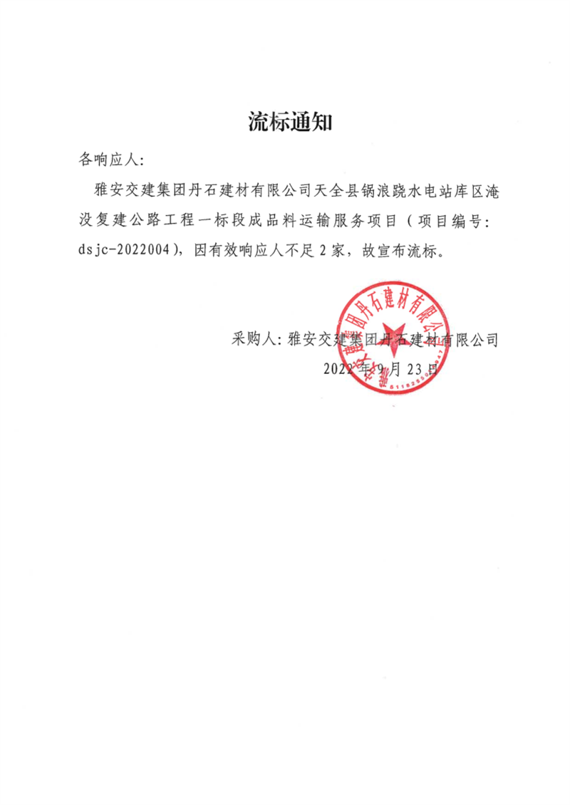 雅安交建集團(tuán)丹石建材有限公司天全縣鍋浪蹺水電站庫(kù)區(qū)淹沒復(fù)建公路工程一標(biāo)段成品料運(yùn)輸服務(wù)項(xiàng)目流標(biāo)通知