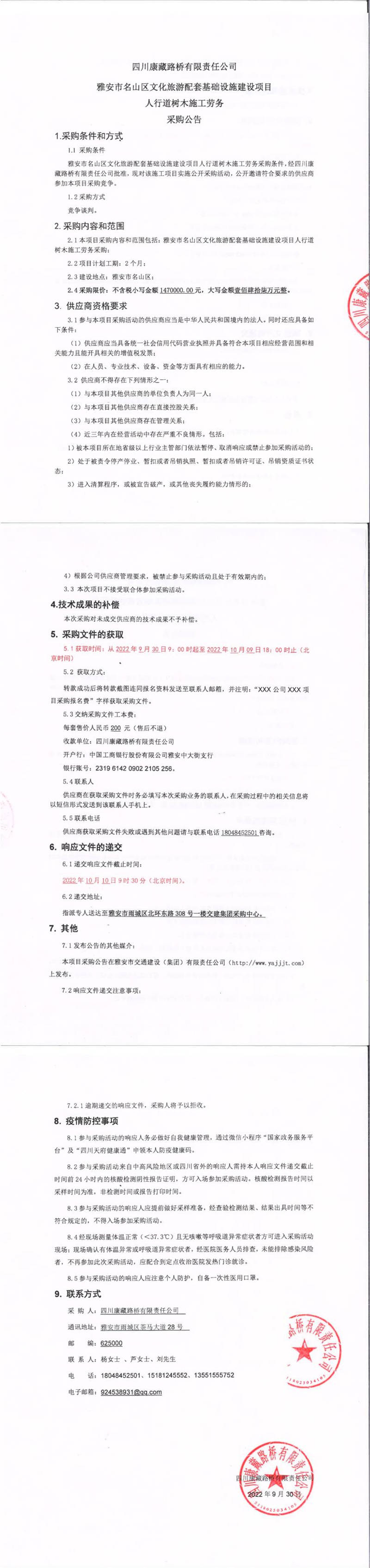 四川康藏路橋有限責(zé)任公司雅安市名山區(qū)文化旅游配套基礎(chǔ)設(shè)施建設(shè)項(xiàng)目人行道樹(shù)木施工勞務(wù)采購(gòu)公告