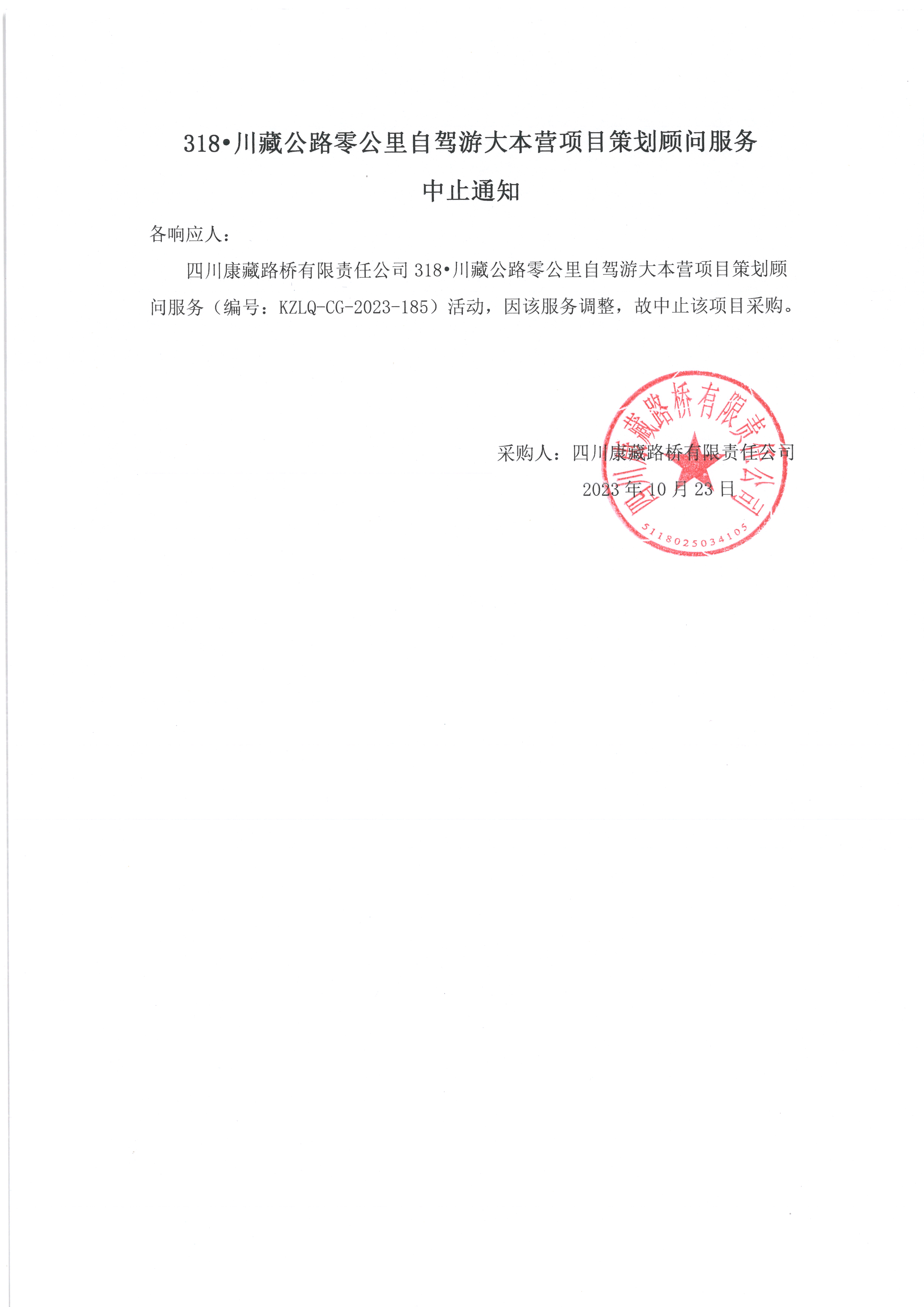 四川康藏路橋有限責任公司318•川藏公路零公里自駕游大本營項目策劃顧問服務中止通知