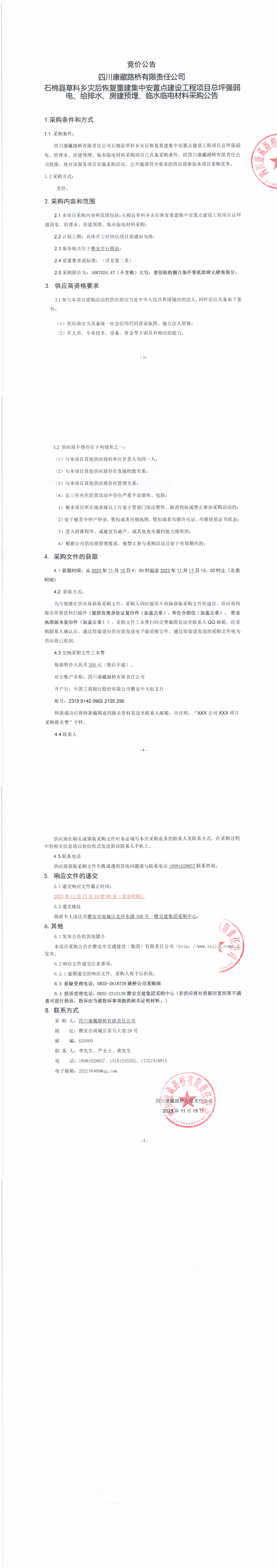 四川康藏路橋有限責(zé)任公司石棉縣草科鄉(xiāng)災(zāi)后恢復(fù)重建集中安置點(diǎn)建設(shè)工程項(xiàng)目總坪強(qiáng)弱電、給排水、房建預(yù)埋、臨水臨電材料采購公告