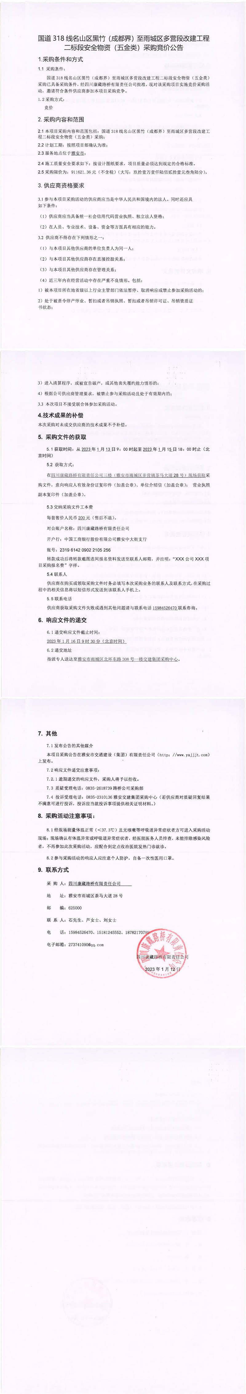 四川康藏路橋有限責(zé)任公司國道318線名山區(qū)黑竹(成都界)至雨城區(qū)多營段改建工程二標(biāo)段安全物資(五金類)采購競價公告