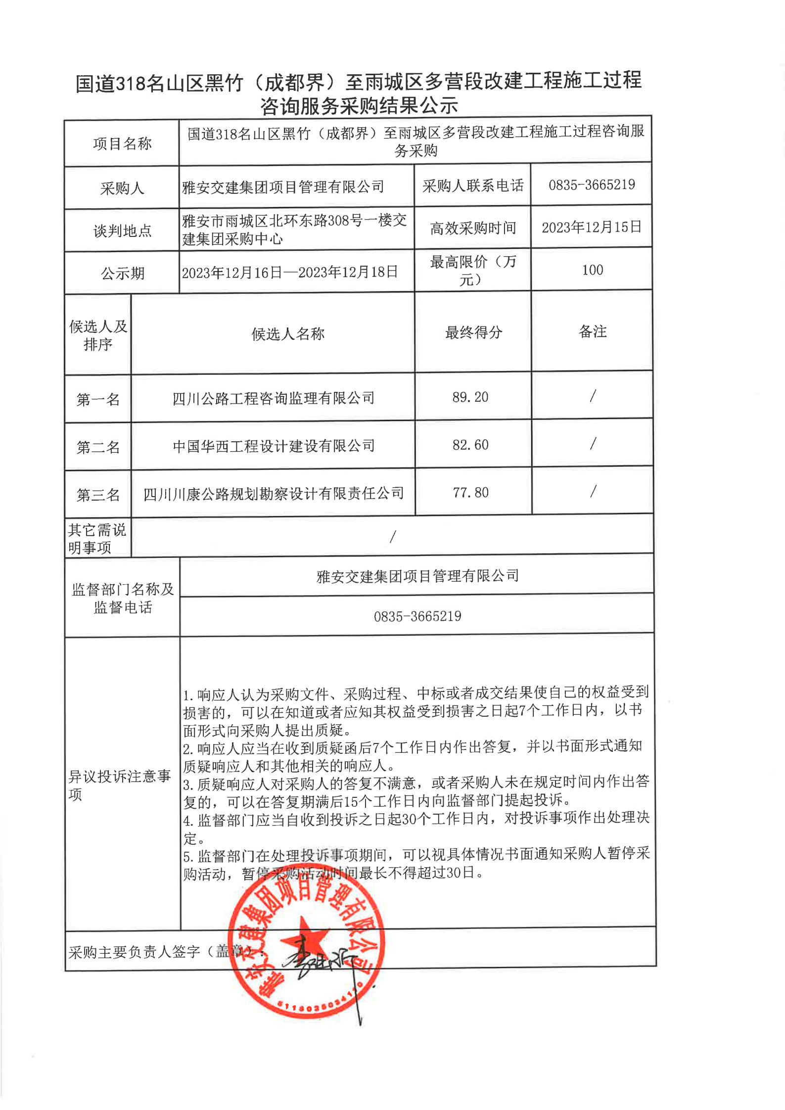 雅安交建集團(tuán)項(xiàng)目管理有限公司國(guó)道318名山區(qū)黑竹(成都界)至雨城區(qū)多營(yíng)段改建工程施工過程咨詢服務(wù)采購(gòu)結(jié)果公示