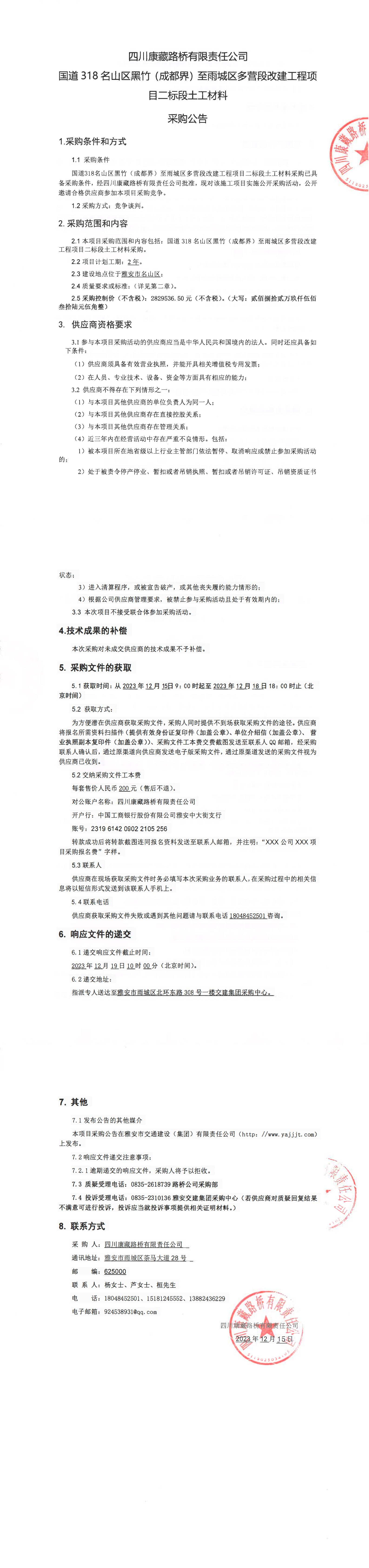四川康藏路橋有限責(zé)任公司國(guó)道318名山區(qū)黑竹(成都界)至雨城區(qū)多營(yíng)段改建工程項(xiàng)目二標(biāo)段土工材料采購公告
