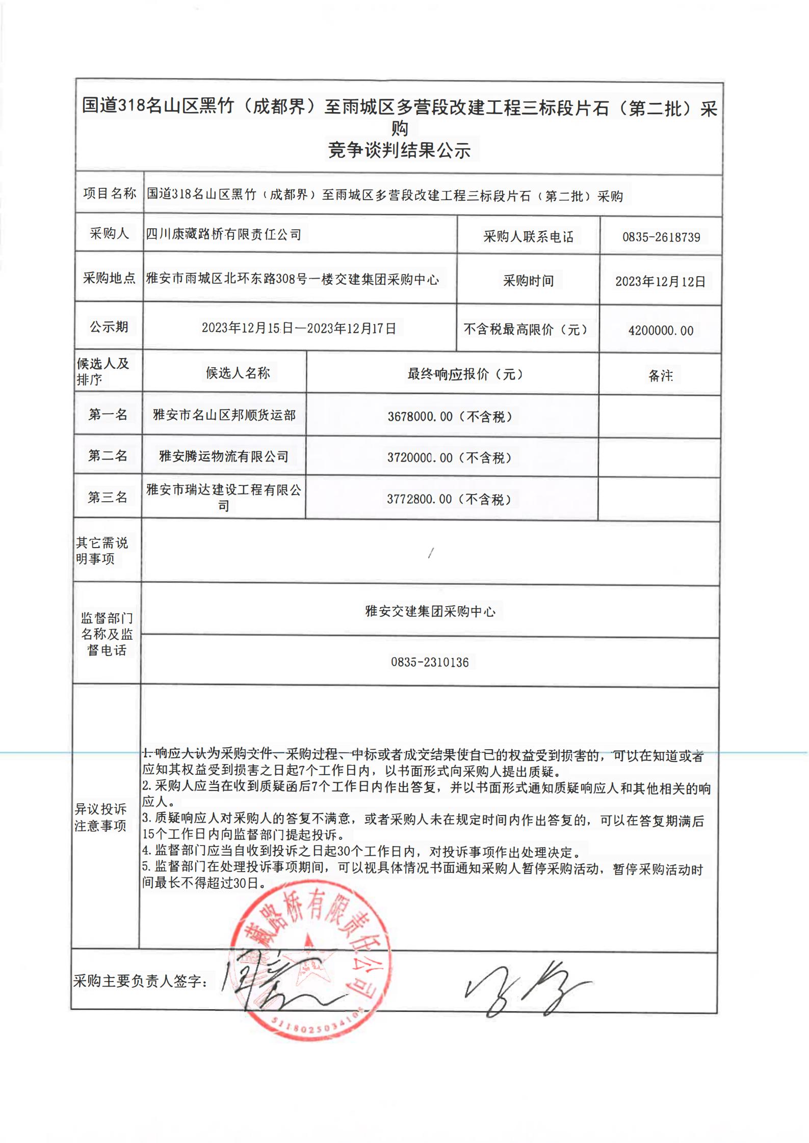 四川康藏路橋有限責(zé)任公司國(guó)道318名山區(qū)黑竹(成都界)至雨城區(qū)多營(yíng)段改建工程三標(biāo)段片石(第二批)采購(gòu)競(jìng)爭(zhēng)談判結(jié)果