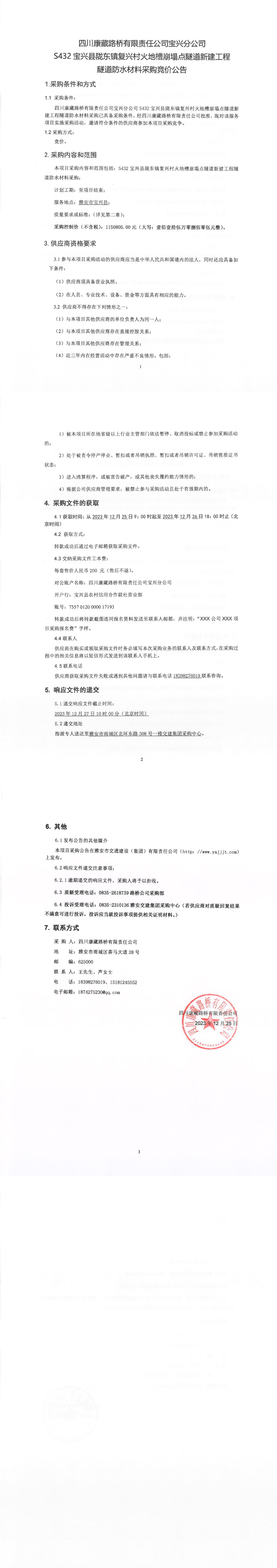 四川康藏路橋有限責(zé)任公司寶興分公司S432寶興縣隴東鎮(zhèn)復(fù)興村火地槽崩塌點(diǎn)隧道新建工程隧道防水材料采購競價(jià)公告