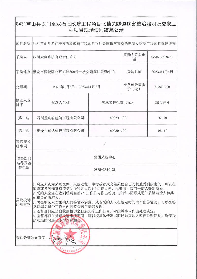 四川康藏路橋有限責任公司S431蘆山縣龍門至雙石段改建工程項目飛仙關(guān)隧道病害整治照明及交安工程項目現(xiàn)場談判結(jié)果公示