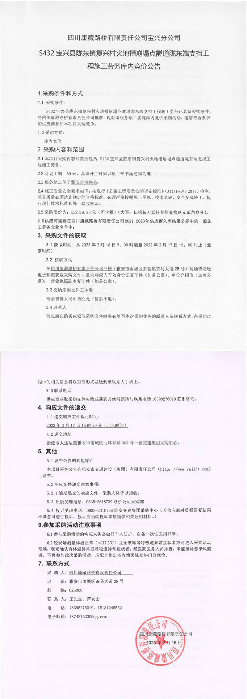 四川康藏路橋有限責任公司寶興分公司S432寶興縣隴東鎮(zhèn)復興村火地槽崩塌點隧道隴東端支擋工程施工勞務庫內競價公告