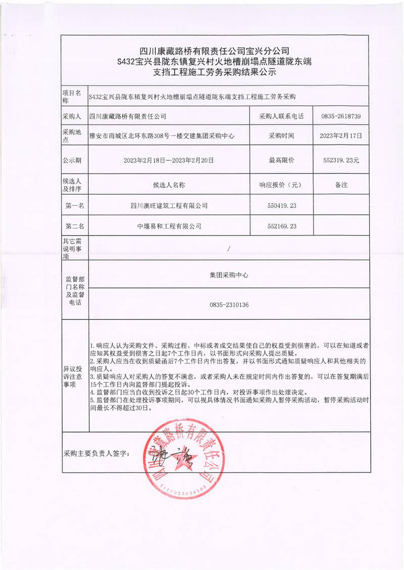 四川康藏路橋有限責(zé)任公司寶興分公司S432寶興縣隴東鎮(zhèn)復(fù)興村火地槽崩塌點隧道隴東端支擋工程勞務(wù)采購結(jié)果公示