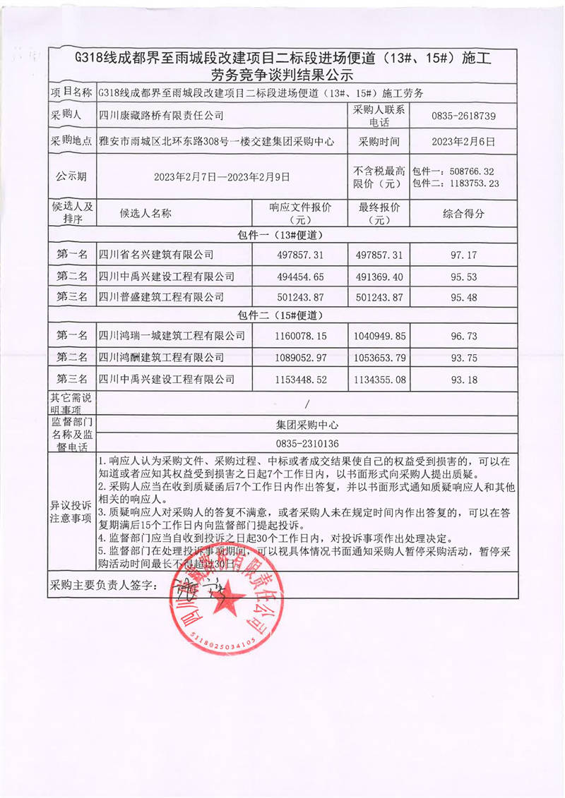 四川康藏路橋有限責(zé)任公司G318線成都界至雨城段改建項(xiàng)目二標(biāo)段進(jìn)場(chǎng)便道(13#、15#)施工勞務(wù)競(jìng)爭(zhēng)談判結(jié)果公示