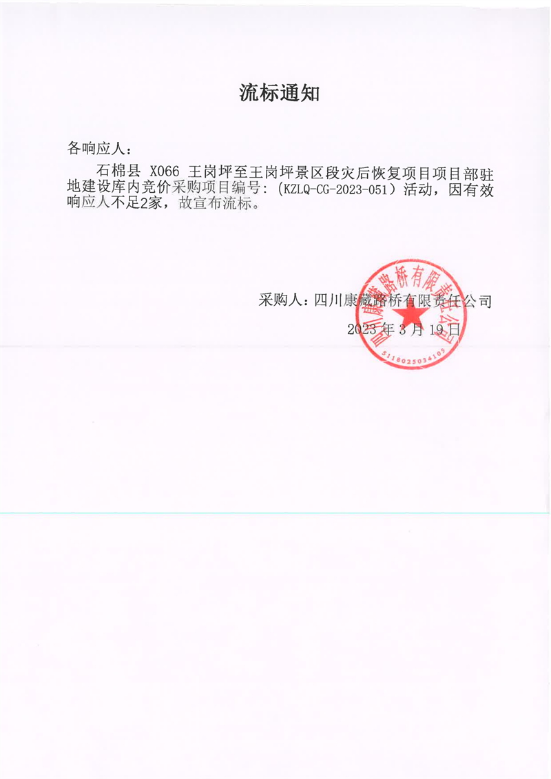 四川康藏路橋有限責任公司石棉縣X066王崗坪至王崗坪景區(qū)段災(zāi)后恢復(fù)項目項目部駐地建設(shè)庫內(nèi)競價采購流標通知