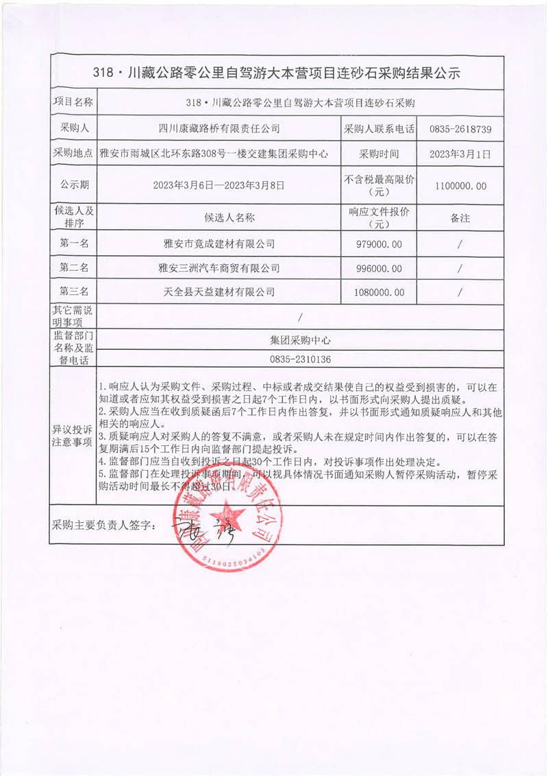 四川康藏路橋有限責(zé)任公司318·川藏公路零公里自駕游大本營項(xiàng)目連砂石采購結(jié)果公示