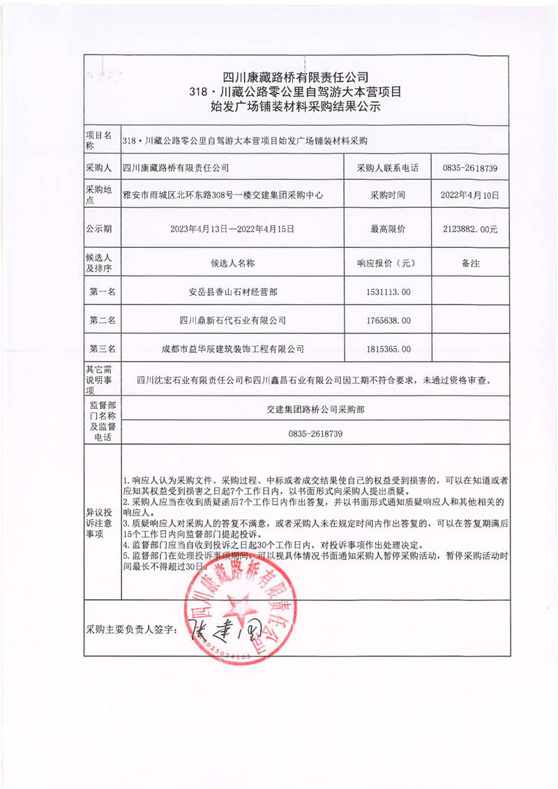 四川康藏路橋有限責(zé)任公司318·川藏公路零公里自駕游大本營(yíng)項(xiàng)目始發(fā)廣場(chǎng)鋪裝材料采購(gòu)結(jié)果公示