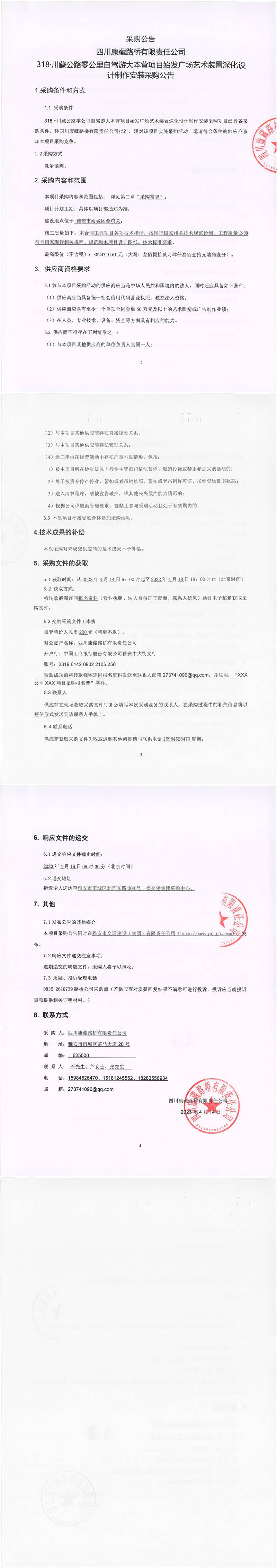四川康藏路橋有限責任公司318·川藏公路零公里自駕游大本營項目始發(fā)廣場藝術裝置深化設計制作安裝采購公告