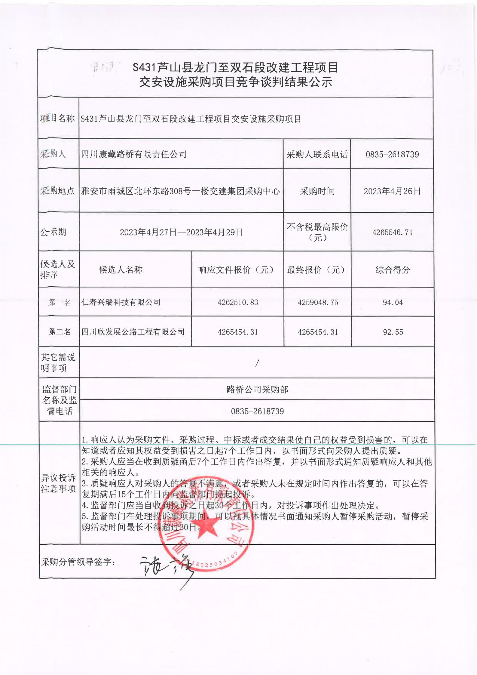 四川康藏路橋有限責任公司S431蘆山縣龍門至雙石段改建工程項目交安設施采購項目競爭談判結(jié)果公示