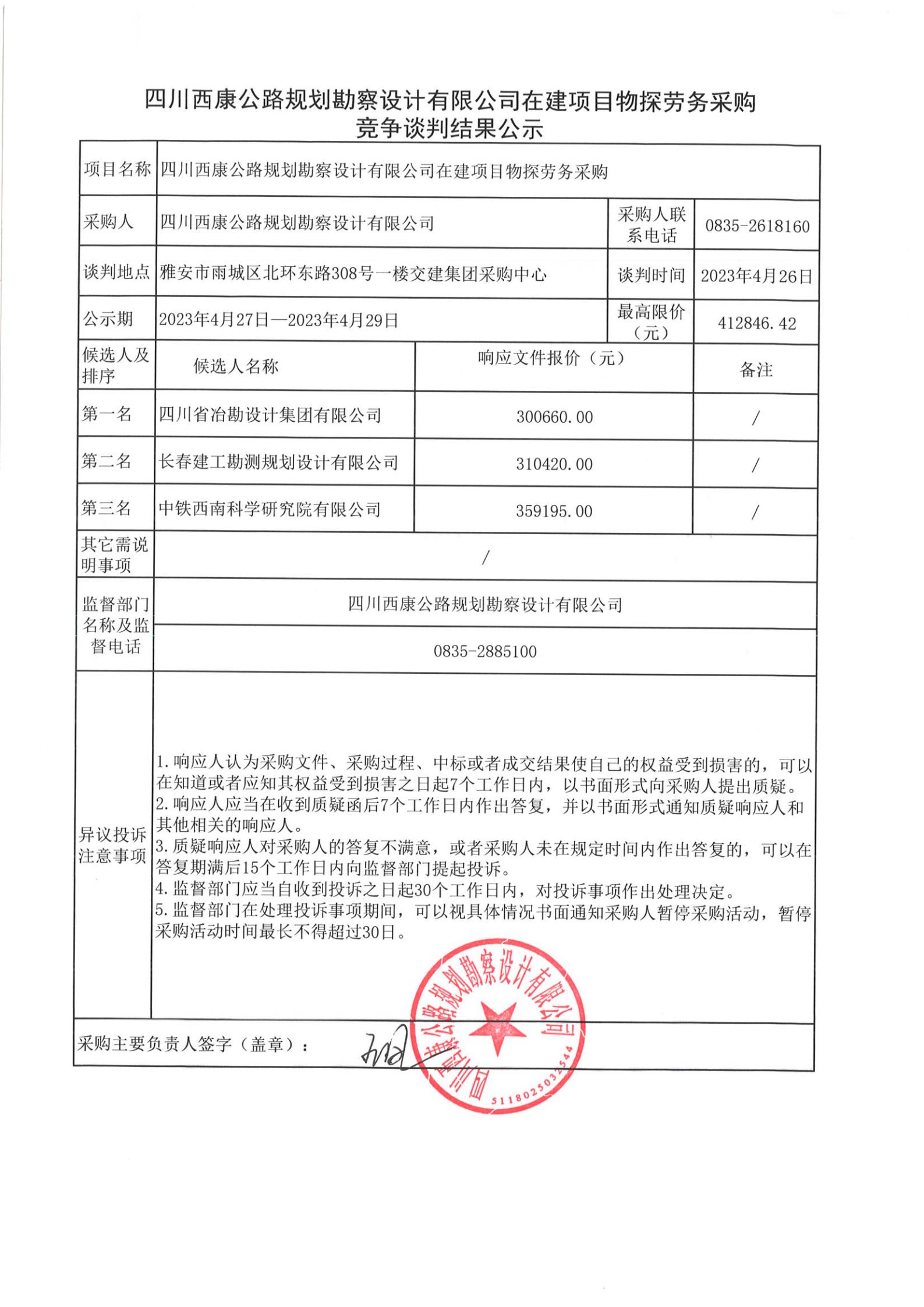四川西康公路規(guī)劃勘察設(shè)計(jì)有限公司在建項(xiàng)目物探勞務(wù)采購競爭談判結(jié)果公示