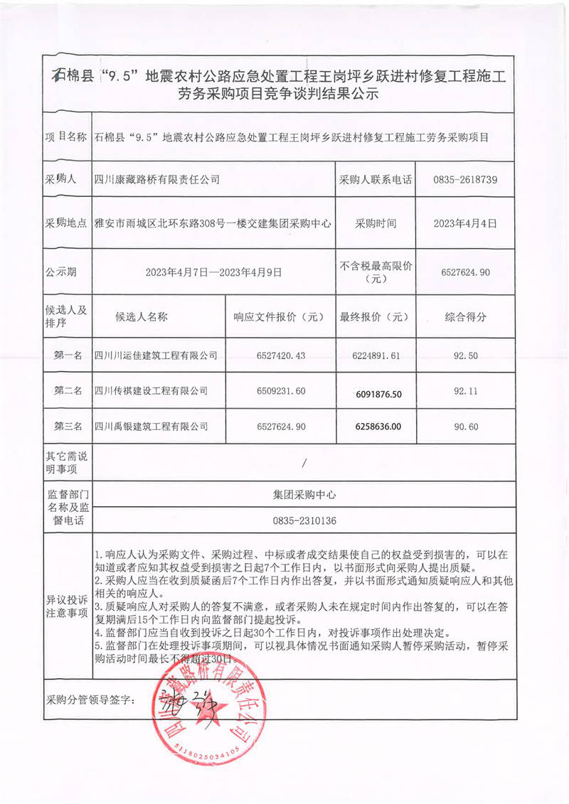 四川康藏路橋有限責(zé)任公司石棉縣“9.5”地震農(nóng)村公路應(yīng)急處置工程王崗坪鄉(xiāng)躍進(jìn)村修復(fù)工程施工勞務(wù)采購項(xiàng)目競爭談判結(jié)果公示