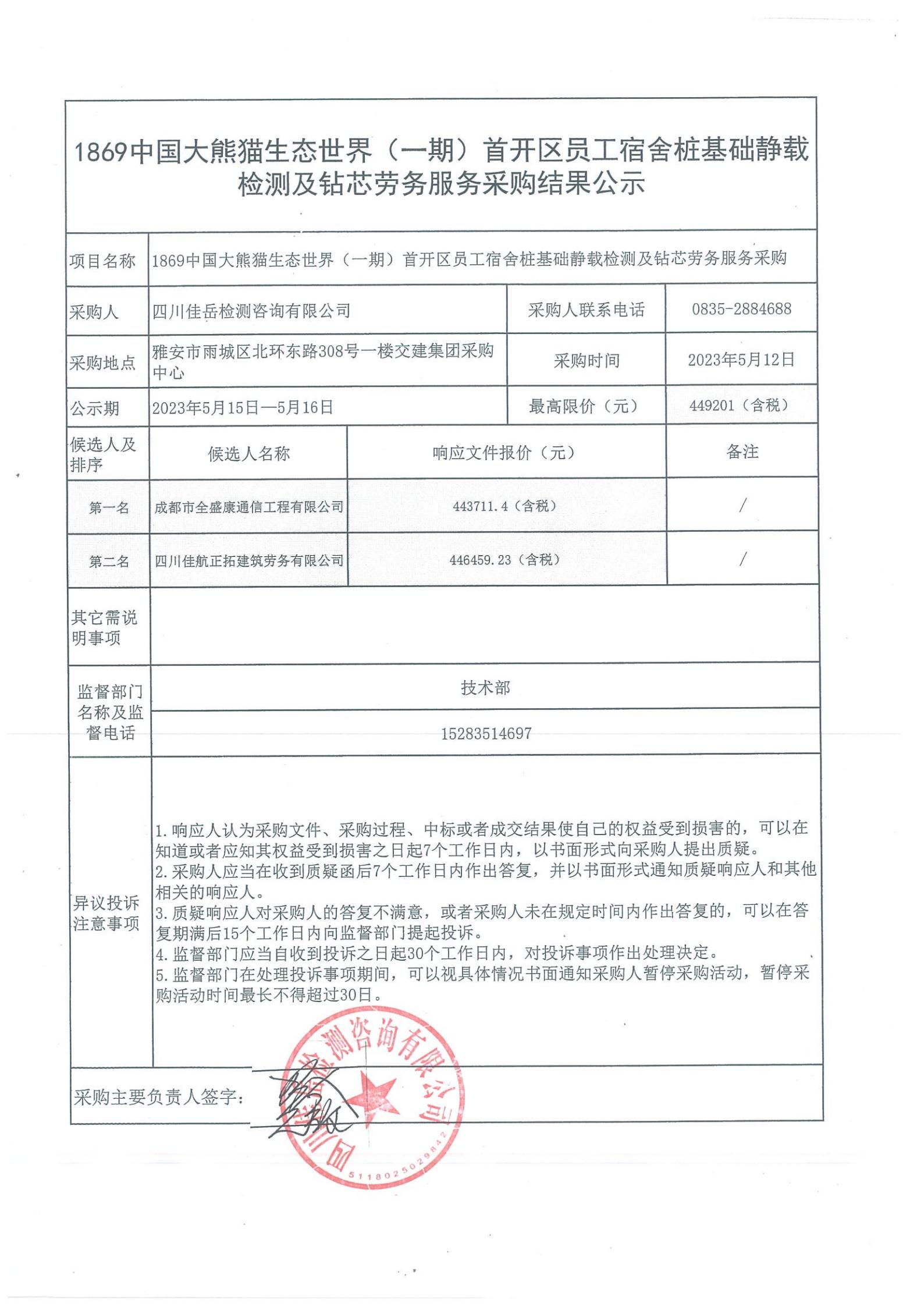 四川佳岳檢測咨詢有限公司關(guān)于1869中國大熊貓生態(tài)世界(一期)首開區(qū)員工宿舍樁基礎(chǔ)靜載檢測勞務(wù)及鉆芯項目中標結(jié)果公示