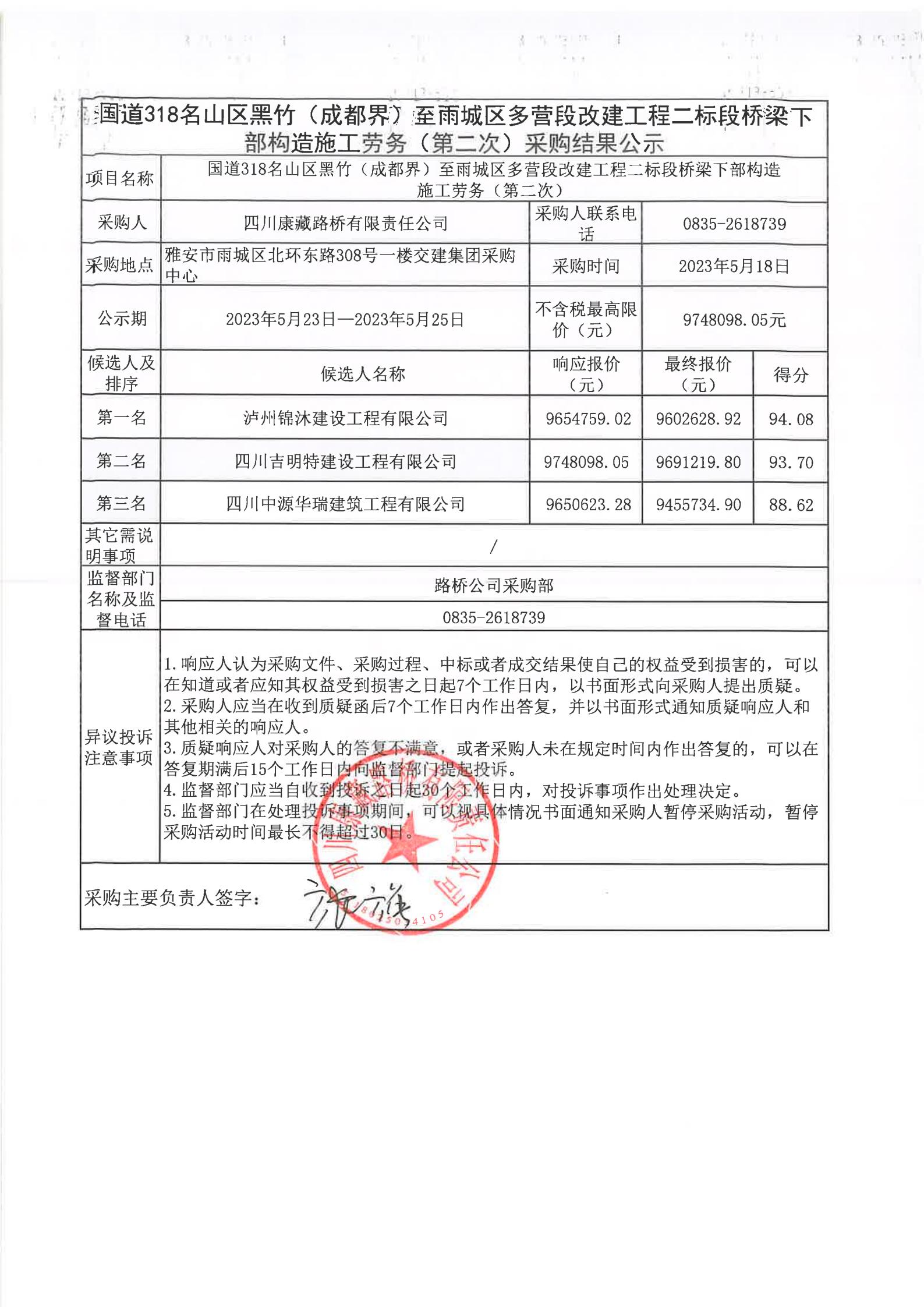 四川康藏路橋有限責(zé)任公司國道318名山區(qū)黑竹(成都界)至雨城區(qū)多營段改建工程二標(biāo)段橋梁下部構(gòu)造施工勞務(wù)(第二次)采購結(jié)果公示