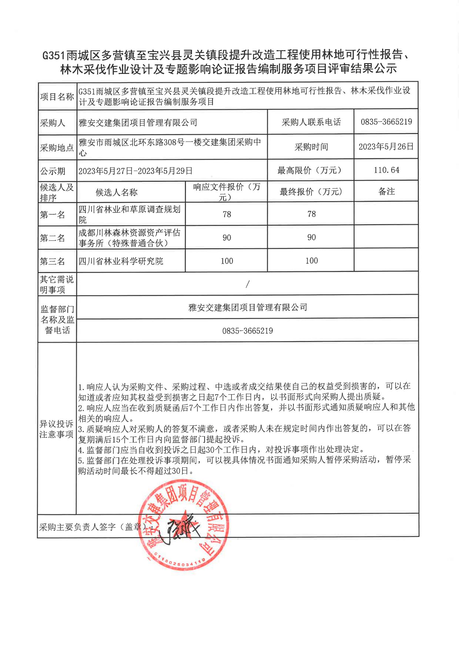 雅安交建集團項目管理有限公司G351雨城區(qū)多營鎮(zhèn)至寶興縣靈關鎮(zhèn)段提升改造工程使用林地可行性報告、林木采伐作業(yè)設計及專題影響論證報告編制服務項目評審結果公示