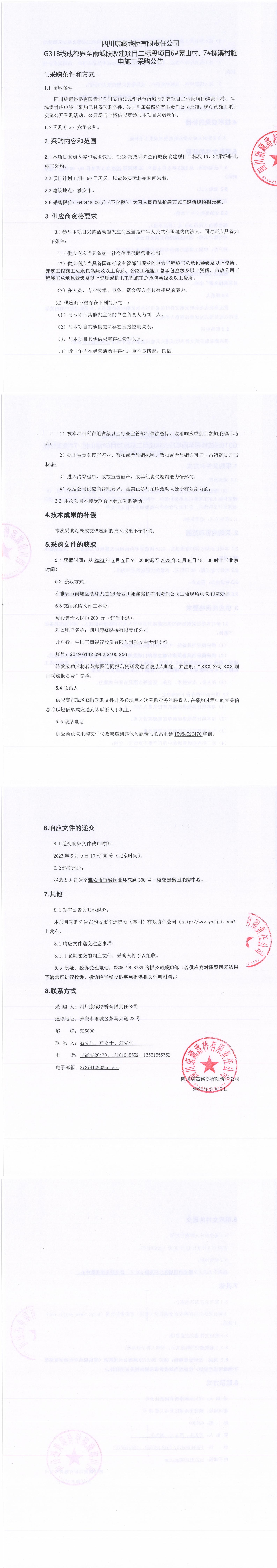 四川康藏路橋有限責(zé)任公司G318線成都至雨城段改建項(xiàng)目二標(biāo)段項(xiàng)目6#蒙山村、7#槐溪村臨時(shí)電施工采購公告
