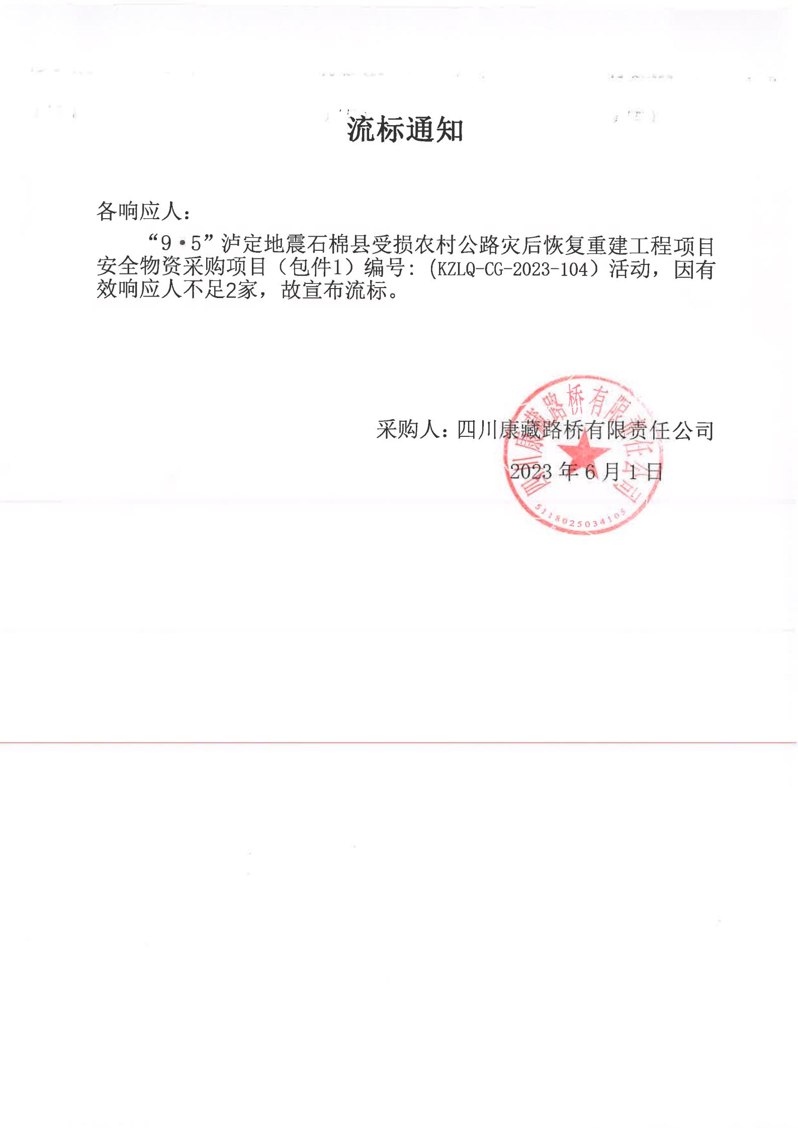 四川康藏路橋有限責(zé)任公司“9·5”瀘定地震石棉縣受損農(nóng)村公路災(zāi)后恢復(fù)重建工程項目安全物資項目(包件1)流標(biāo)通知