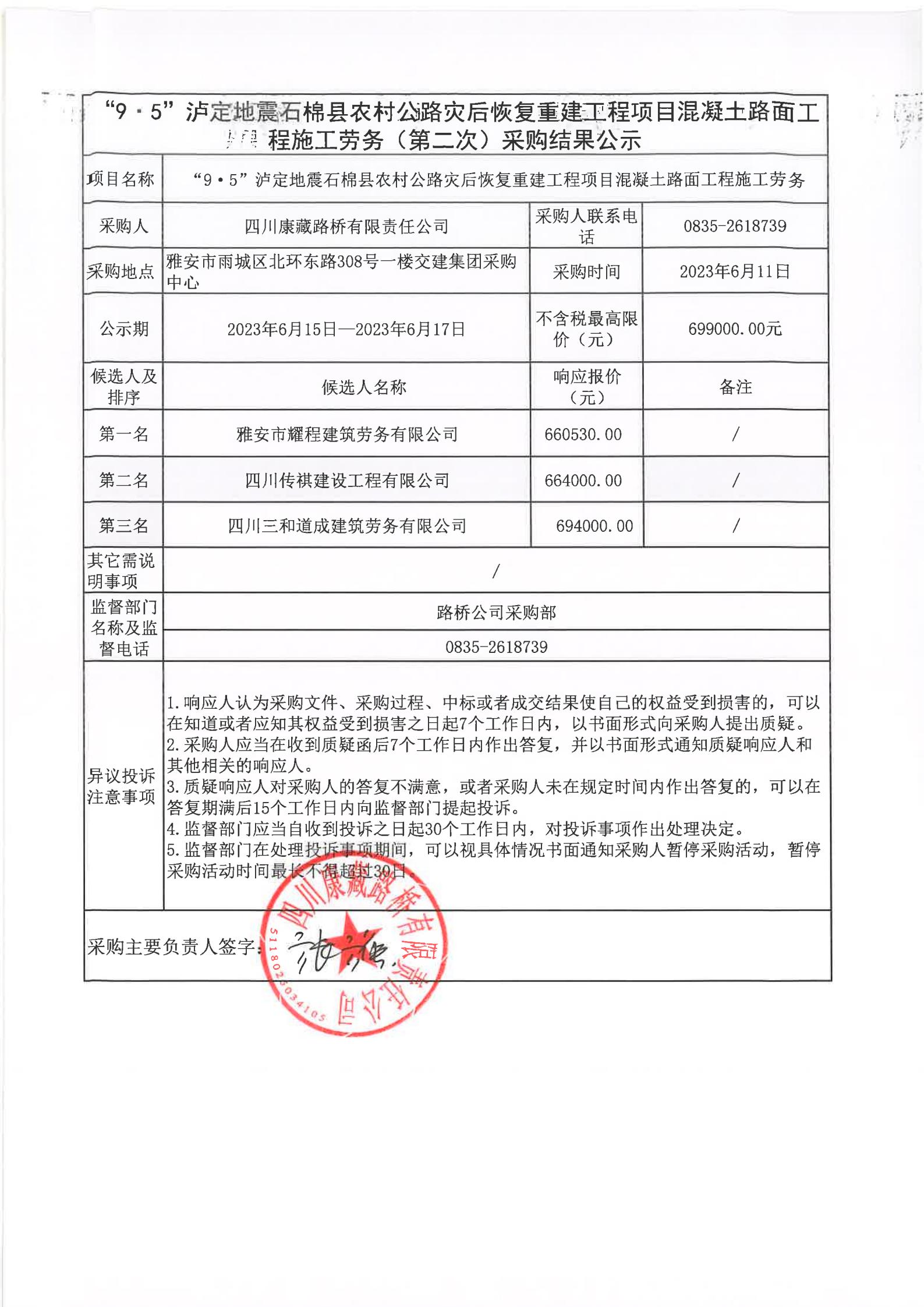 四川康藏路橋有限責(zé)任公司“9·5”瀘定地震石棉縣農(nóng)村公路災(zāi)后恢復(fù)重建工程項目混凝土路面工程施工勞務(wù)采購(第二次)結(jié)果公示