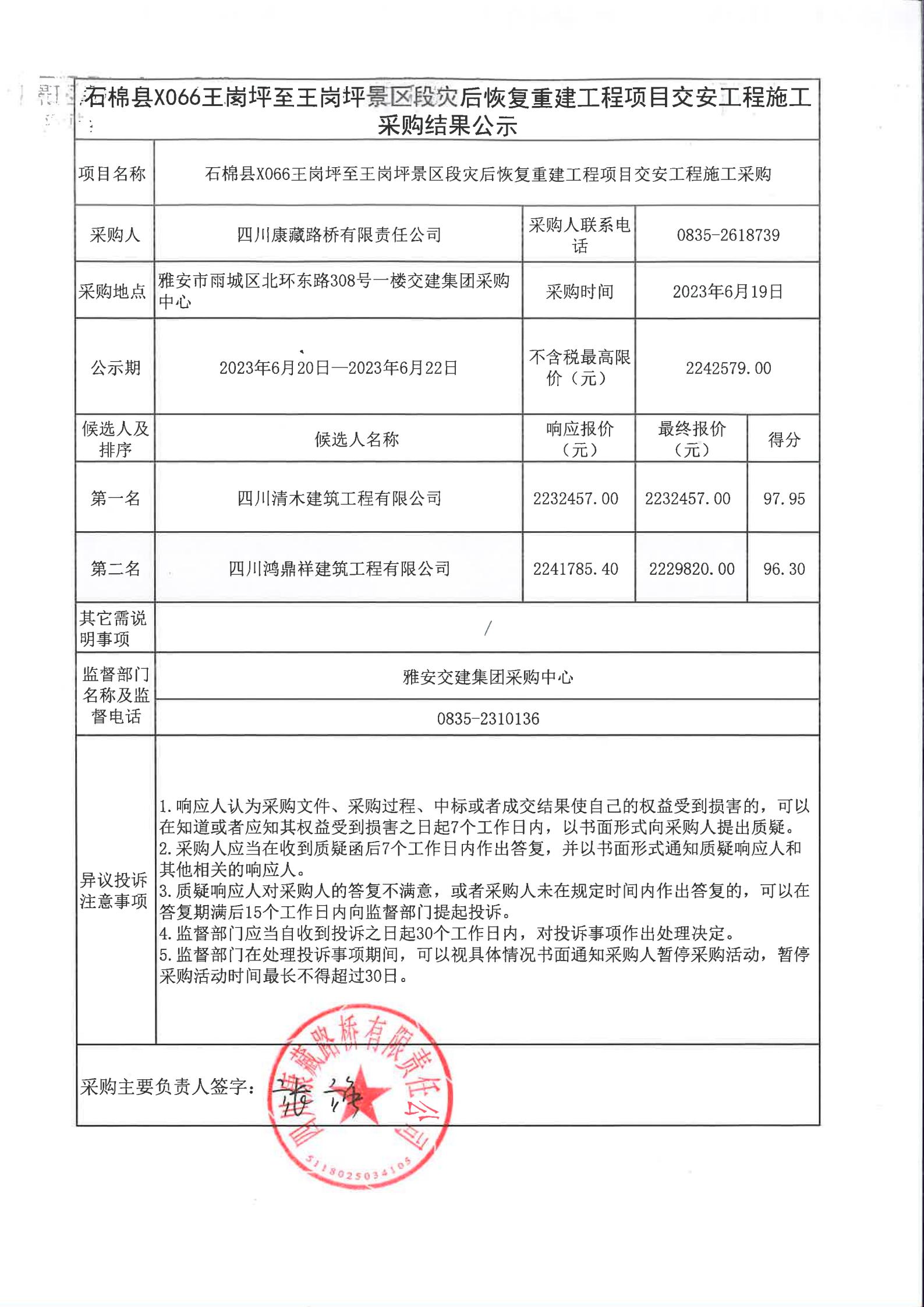 四川康藏路橋有限責(zé)任公司石棉縣X066王崗坪至王崗坪景區(qū)段災(zāi)后恢復(fù)重建工程項(xiàng)目交安工程施工采購(gòu)結(jié)果公示