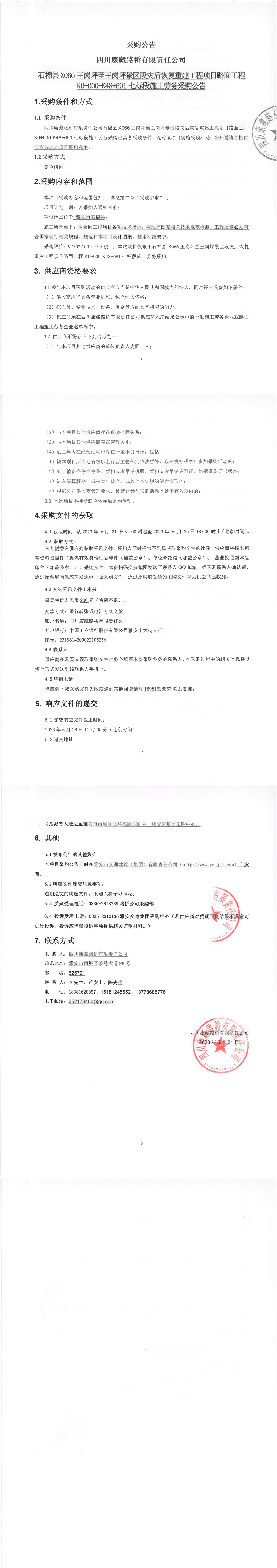 四川康藏路橋有限責(zé)任公司石棉縣X066王崗坪至王崗坪景區(qū)段災(zāi)后恢復(fù)重建工程項(xiàng)目路面工程K0+000-K48+691七標(biāo)段施工勞務(wù)采購(gòu)公告