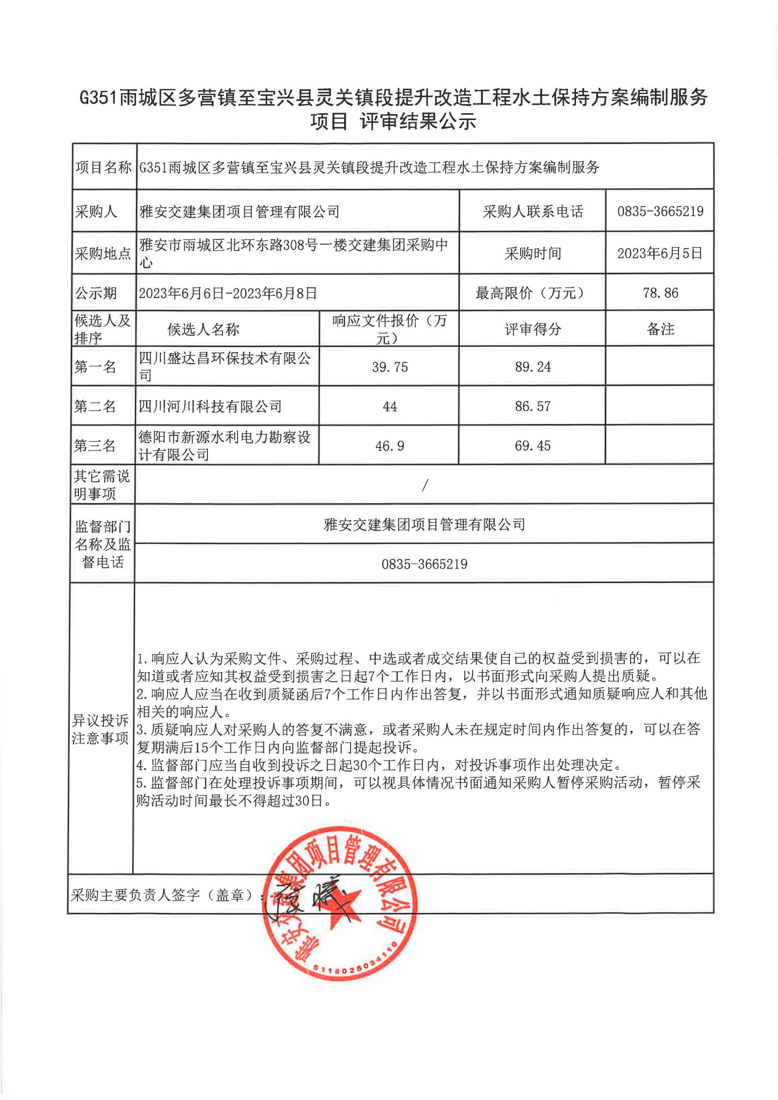雅安交建集團項目管理有限公司G351雨城區(qū)多營鎮(zhèn)至寶興縣靈關(guān)鎮(zhèn)段提升改造工程水土保持方案編制服務(wù)項目評審結(jié)果公示