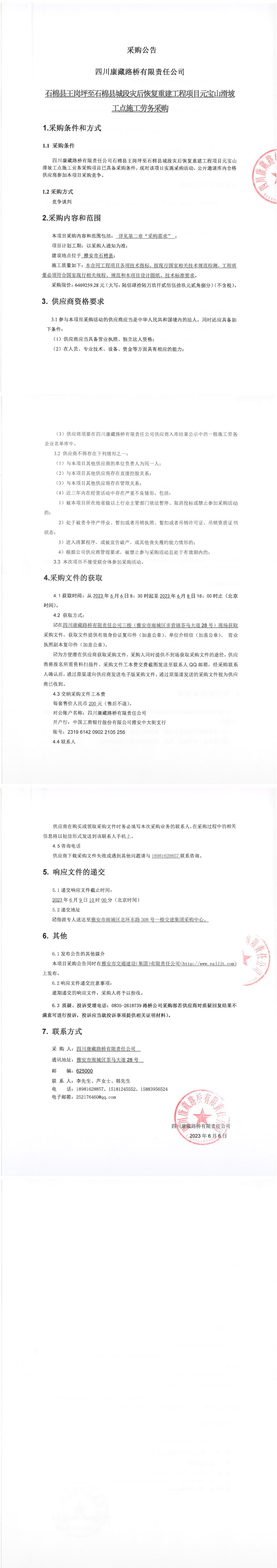 四川康藏路橋有限責(zé)任公司石棉縣王崗坪至石棉縣城段災(zāi)后恢復(fù)重建工程項(xiàng)目元寶山滑坡工點(diǎn)施工勞務(wù)采購(gòu)