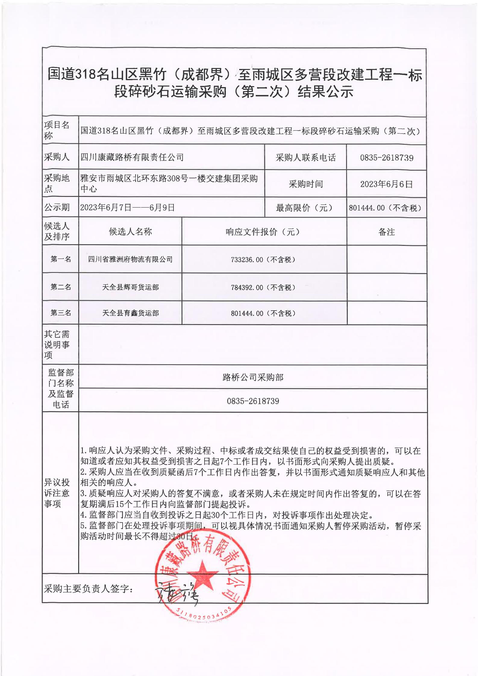 四川康藏路橋有限責任公司國道318名山區(qū)黑竹(成都界)至雨城區(qū)多營段改建工程一標段碎砂石運輸采購(第二次)結果公示