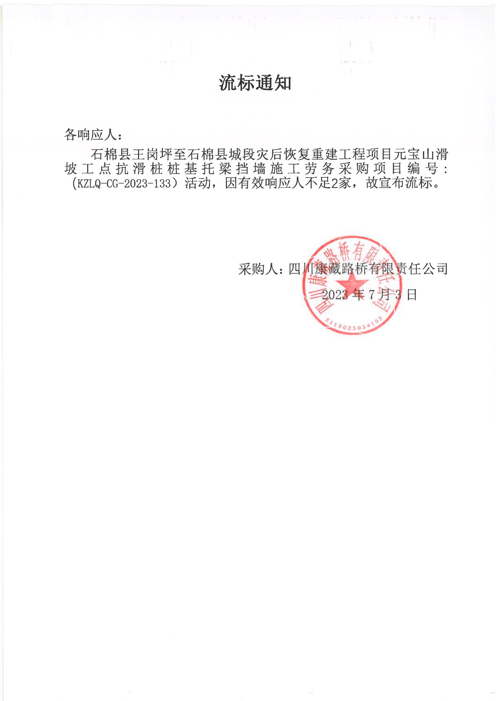 四川康藏路橋有限責(zé)任公司石棉縣王崗坪至石棉縣城段災(zāi)后恢復(fù)重建工程項(xiàng)目元寶山滑坡工點(diǎn)抗滑樁樁基托梁擋墻施工勞務(wù)采購流標(biāo)通知