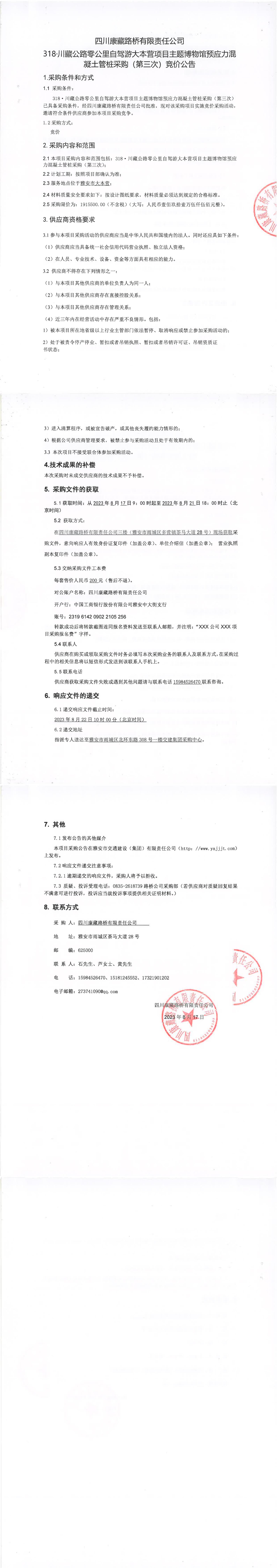 四川康藏路橋有限責(zé)任公司318·川藏公路零公里自駕游大本營(yíng)項(xiàng)目主題博物館預(yù)應(yīng)力混凝土管樁采購(第三次)競(jìng)價(jià)公告