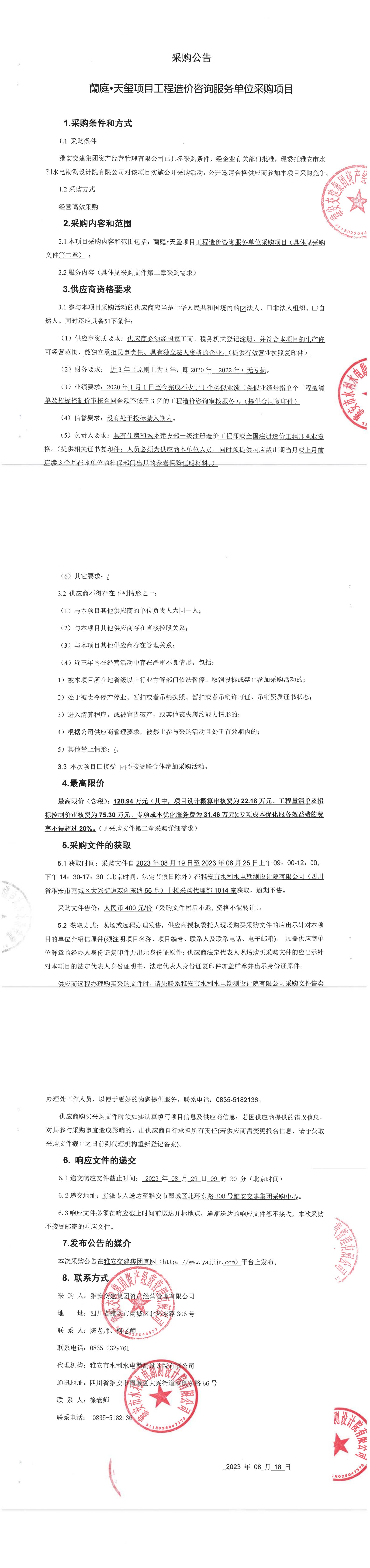 雅安交建集團資產經營管理有限公司蘭庭·天璽項目工程造價咨詢服務單位采購項目采購公告