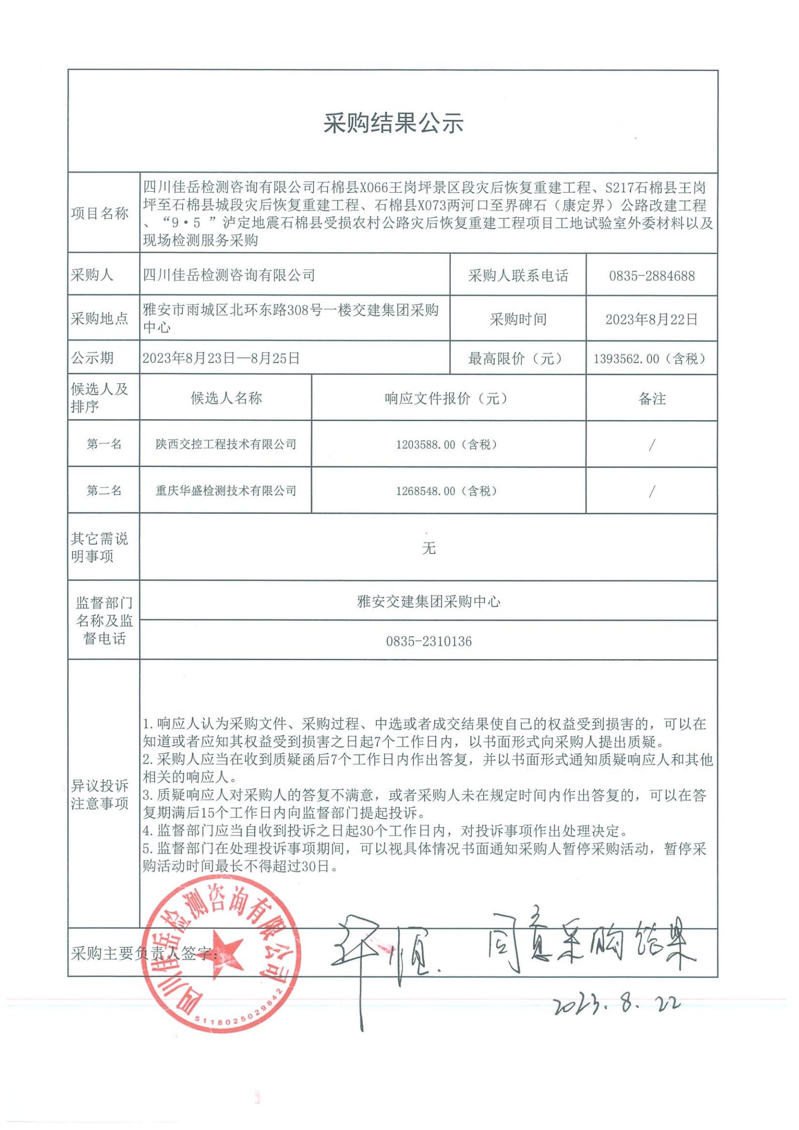 四川佳岳檢測咨詢有限公司石棉縣X066王崗坪至王崗坪景區(qū)段災(zāi)后恢復(fù)重建工程、S217石棉縣王崗坪至石棉縣城段災(zāi)后恢復(fù)重建工程、石棉縣X073兩河口至界碑石(康定界)公路改建工程、“9·5”瀘定地震石棉縣受損農(nóng)村公路災(zāi)后恢復(fù)重建工程項目外委材料以及現(xiàn)場檢測試驗檢測服務(wù)采購庫內(nèi)競價結(jié)果公示