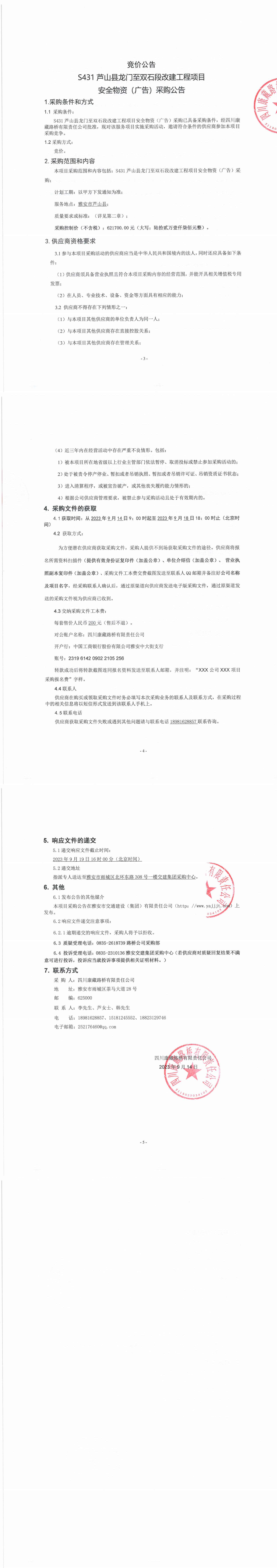 四川康藏路橋有限責任公司S431蘆山縣龍門至雙石段改建工程項目安全物資(廣告)采購公告
