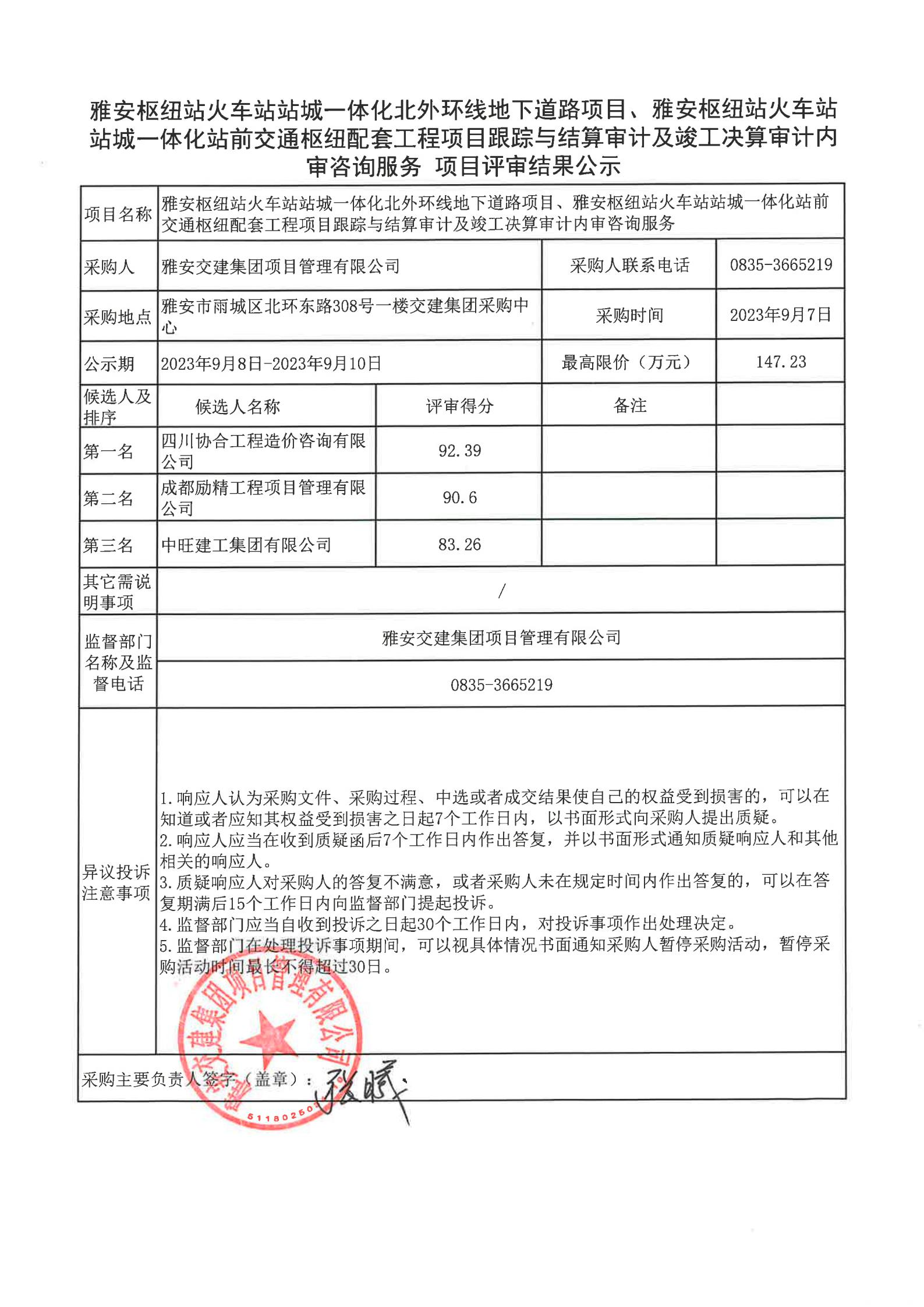 雅安交建集團(tuán)項目管理有限公司雅安樞紐站火車站站城一體化北外環(huán)線地下道路項目、樞紐站火車站站成一體化站前交通樞紐配套工程項目跟蹤與結(jié)算審計及竣工決算審計內(nèi)審咨詢服務(wù)項目評審結(jié)果公示