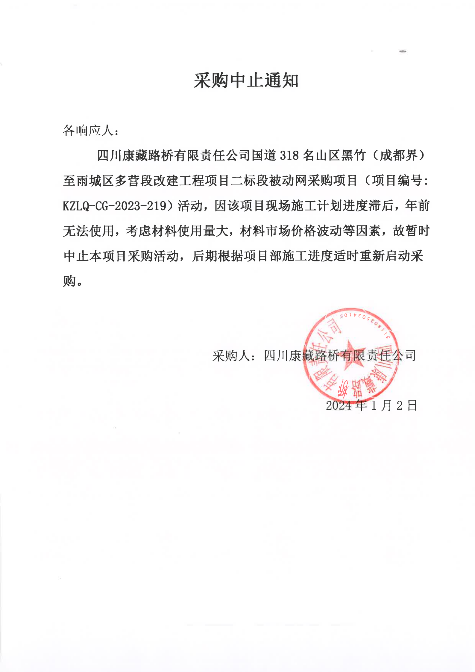 四川康藏路橋有限責任公司國道318名山區(qū)黑竹(成都界)至雨城區(qū)多營段改建工程項目二標段被動網采購項目采購中止通知