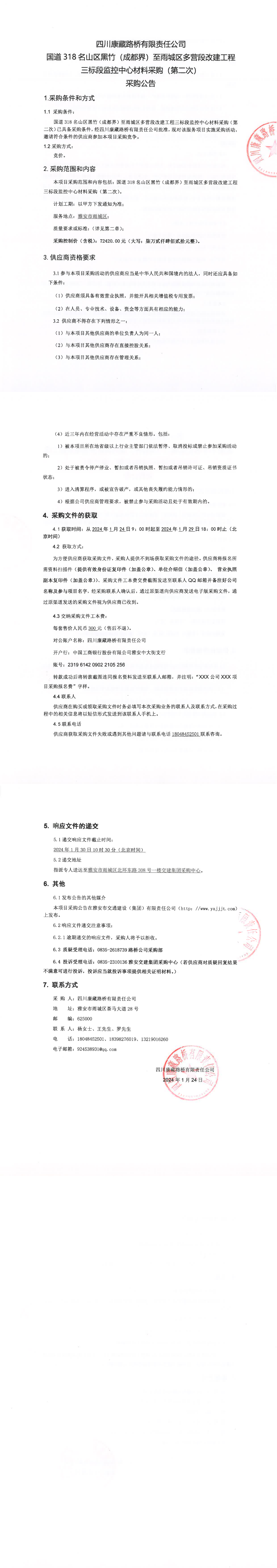 四川康藏路橋有限責(zé)任公司國(guó)道318名山區(qū)黑竹(成都界)至雨城區(qū)多營(yíng)段改建工程三標(biāo)段監(jiān)控中心材料采購(第二次)采購公告
