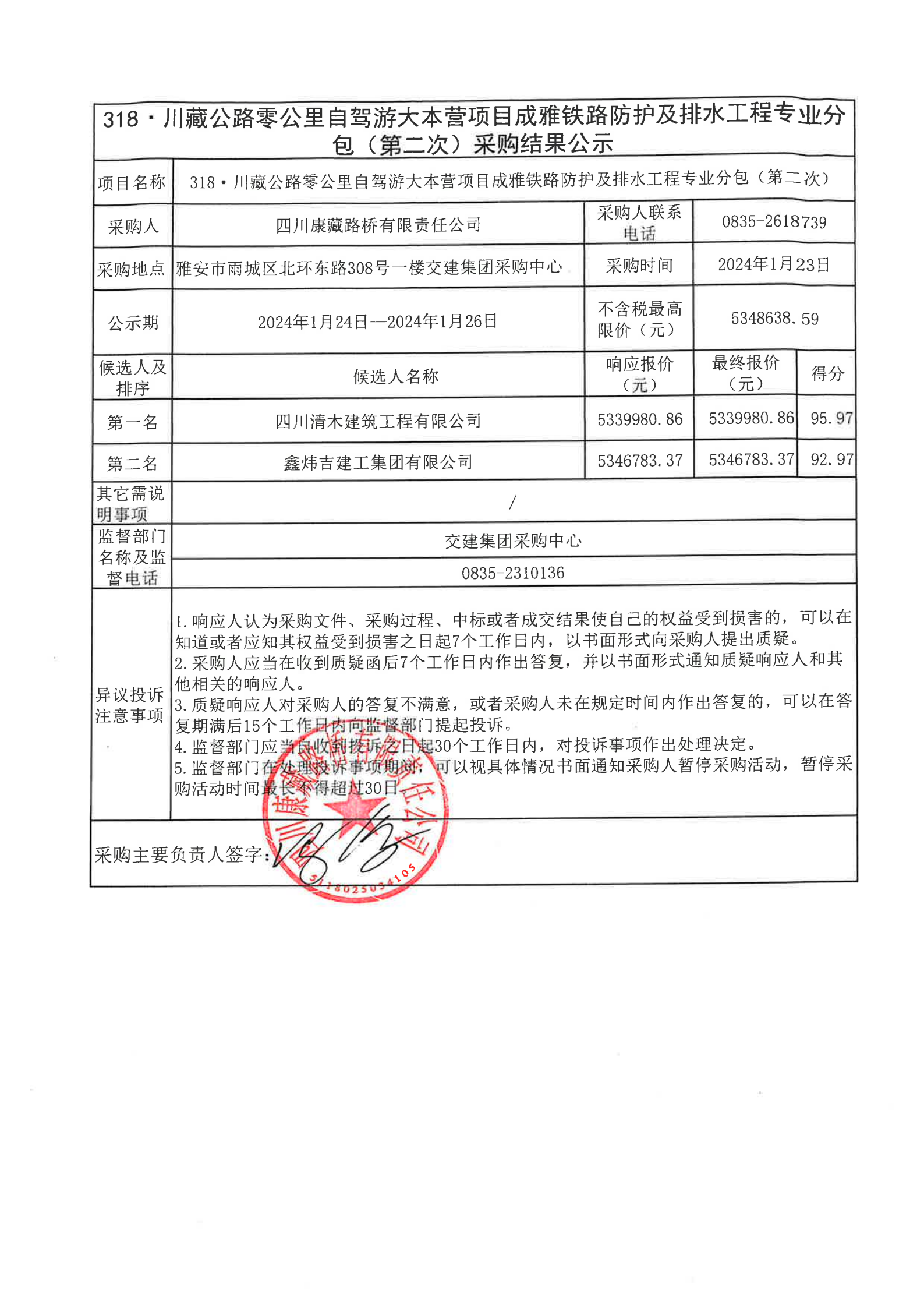 四川康藏路橋有限責(zé)任公司318·川藏公路零公里自駕游大本營項目成雅鐵路防護及排水工程專業(yè)分包(第二次)采購結(jié)果公示