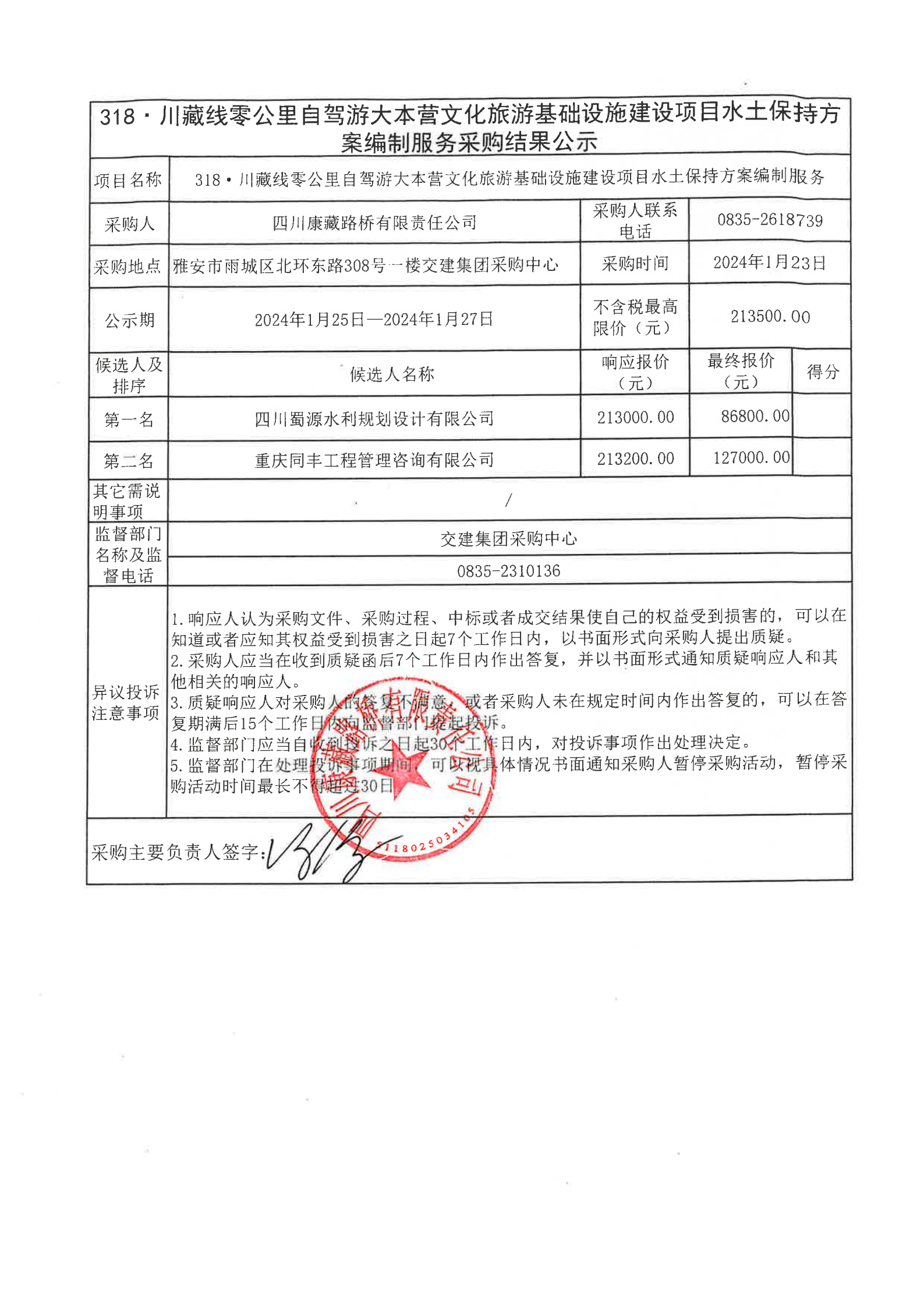 四川康藏路橋有限責(zé)任公司318·川藏線零公里自駕游大本營(yíng)文化旅游基礎(chǔ)設(shè)施建設(shè)項(xiàng)目水土保持方案編制服務(wù)采購(gòu)結(jié)果公示