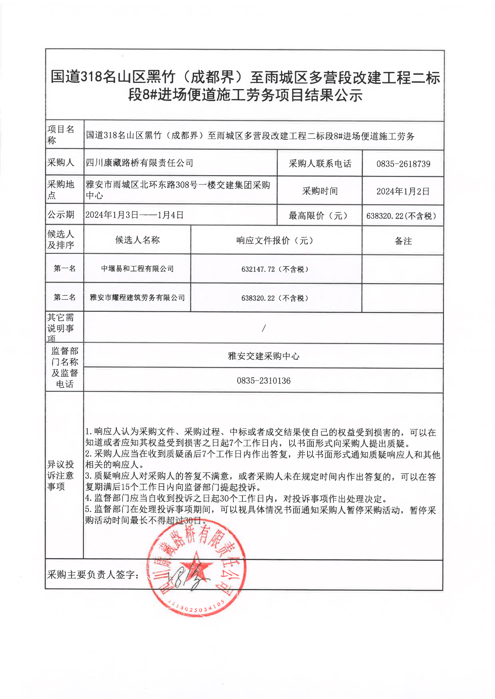 四川康藏路橋有限責任公司國道318名山區(qū)黑竹(成都界)至雨城區(qū)多營段改建工程二標段8#進場便道施工勞務項目結(jié)果公示