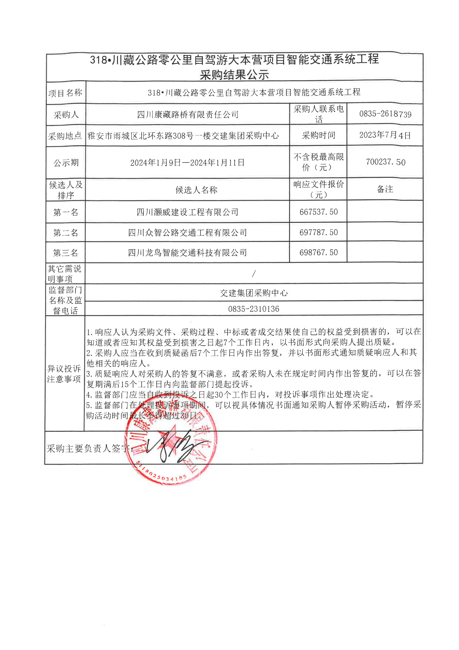 四川康藏路橋有限責(zé)任公司318·川藏公路零公里自駕游大本營(yíng)項(xiàng)目智能交通系統(tǒng)工程采購(gòu)結(jié)果公示