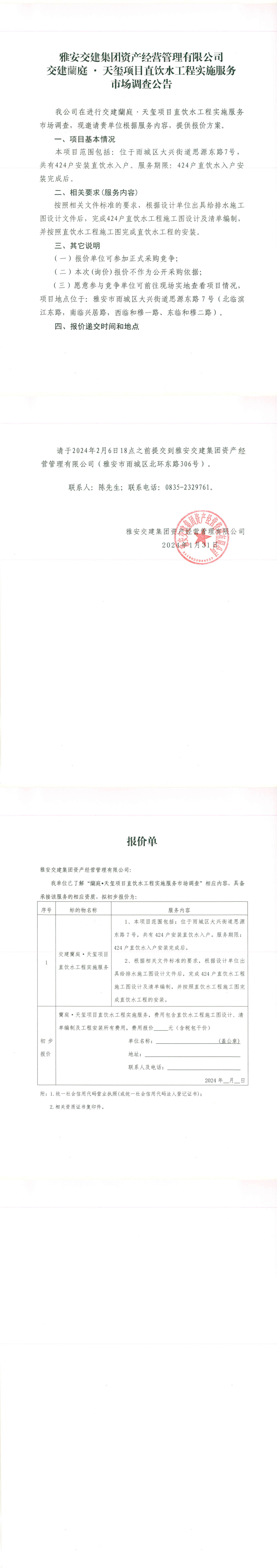 雅安交建集團(tuán)資產(chǎn)經(jīng)營(yíng)管理有限公司交建蘭庭·天璽項(xiàng)目直飲水工程實(shí)施服務(wù)市場(chǎng)調(diào)查公告