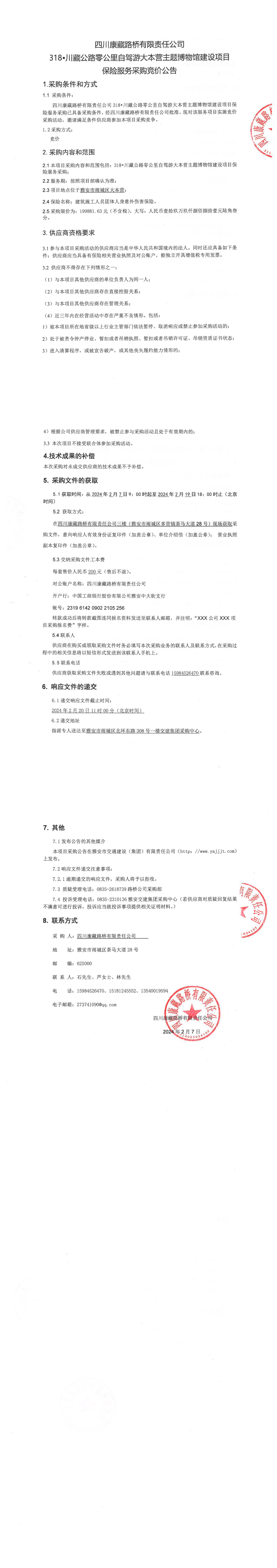四川康藏路橋有限責(zé)任公司318•川藏公路零公里自駕游大本營(yíng)主題博物館建設(shè)項(xiàng)目保險(xiǎn)服務(wù)采購公告